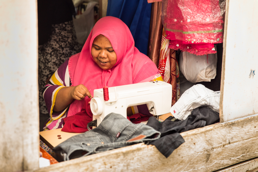 Hay hombres y mujeres costureras en las veredas, puestitos y cuanto lugarcito sirva para poner la máquina de coser.