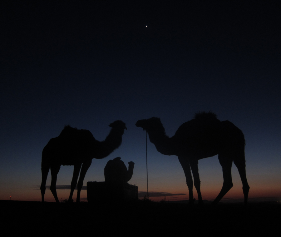 Tres dromedarios, quienes gracias a sus encantos y muecas desde que los conocí se han transformado en mi animal preferido, cenan frente a la puerta del hostel mientras avanza la noche en Hassi Labied, Marruecos.