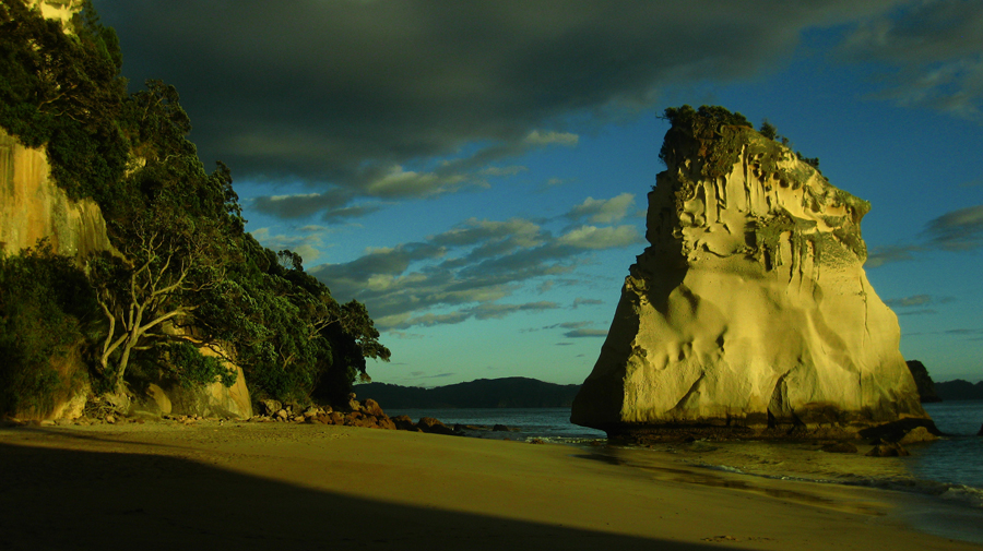 Amanecer en Cathedral Cove, una playa en la península de Coromandel, isla norte de Nueva Zelanda.