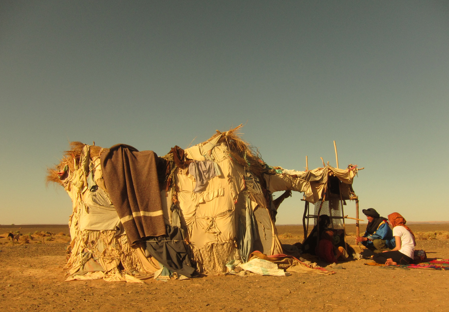 Donde termina la extensión de dunas de Erg Chebbi empieza el Desierto Negro. Allí, en casas con techos y paredes de ropa, viven familias nómadas Bereber.