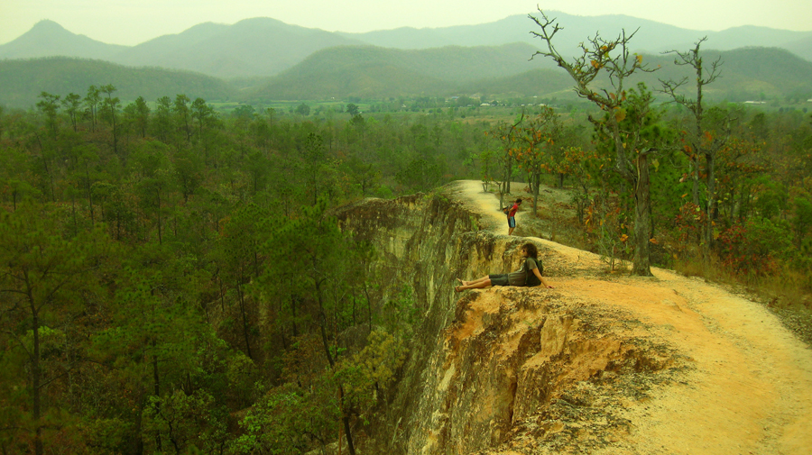 Senderos y acantilados de tierra roja en el Pai Canyon, norte de Tailandia.