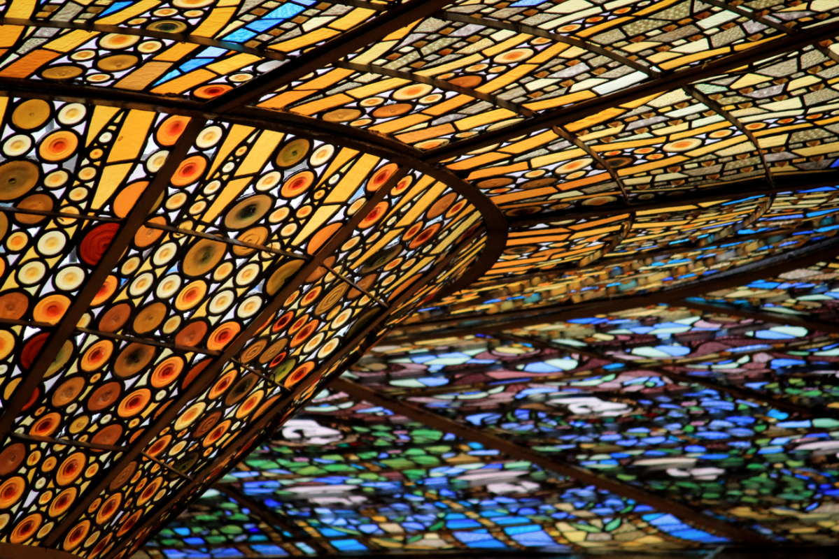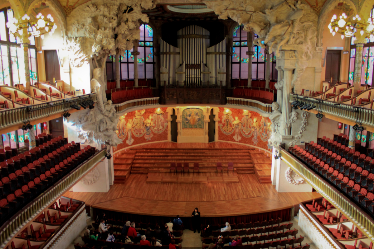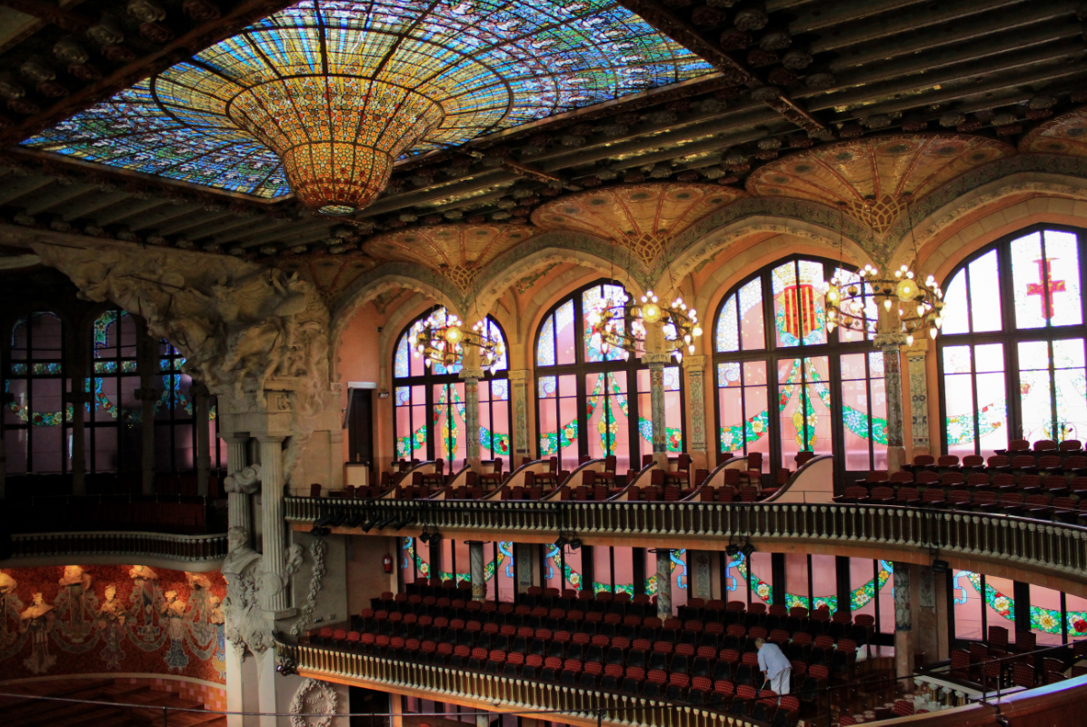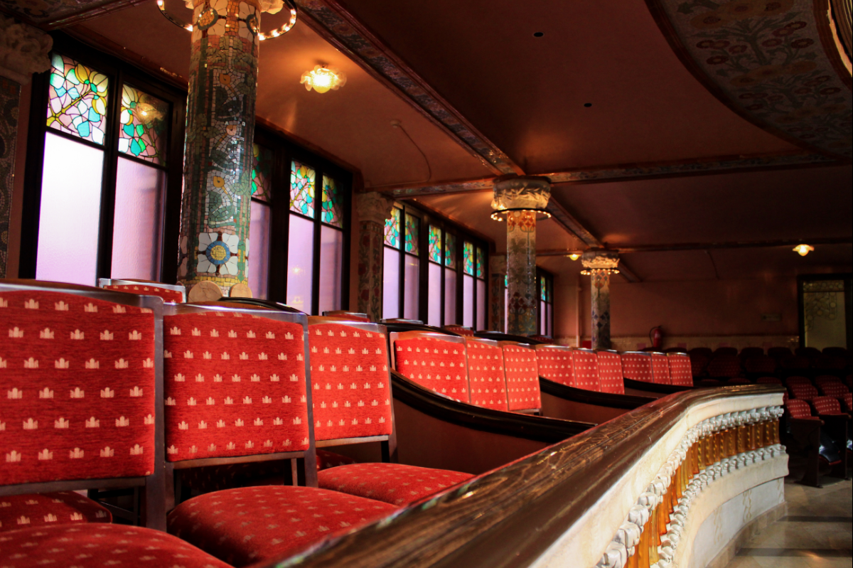El Palau, por ejemplo, tiene uno de los auditorios más peculiares del mundo, rodeado casi en sus 360 grados, e incluso en parte del techo, por vidrios de colores. Cuando Lluís Domènech i Montaner, un arquitecto top de la época, lo creara allá entre 1905 y 1908 gracias a los fondos aportados por la suscripción popular, se tenían algunas dudas sobre cómo podría influir en el sonido la utilización de este material.