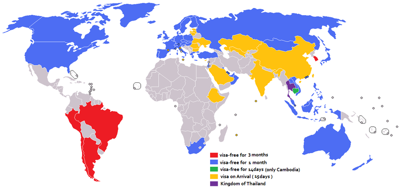Aquellos que viajemos con pasaporte argentino, brasileño, pruano, chileno, paraguayo o surkoreano podemos darnos el lujo de dormir sin frazada, no por el calor y la humedad propios de estas latitudes, sino porque sea como sea que entremos nuestra visa va a ser de 90 días.