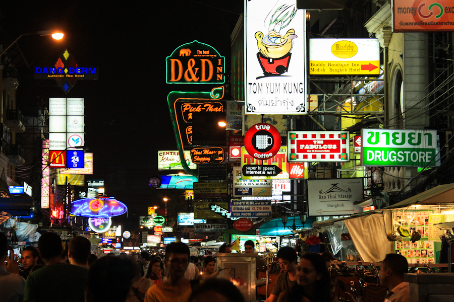 Tan sólo unos pocos metros le son suficientes a Khao San para ser una de las calles más famosas en el mundo de los viajeros. Hasta acá llegan miles de mochileros día tras día en busca de mercados callejeros, falsificaciones de todo tipo, conexiones de viajes, hoteles baratos y, sobre todo, fiesta, alcohol y descontrol.