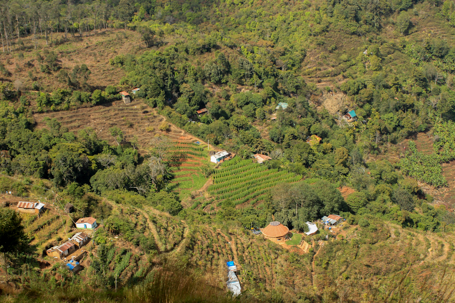 Karuna Farm desde la punta de una de las montañas que la rodean.