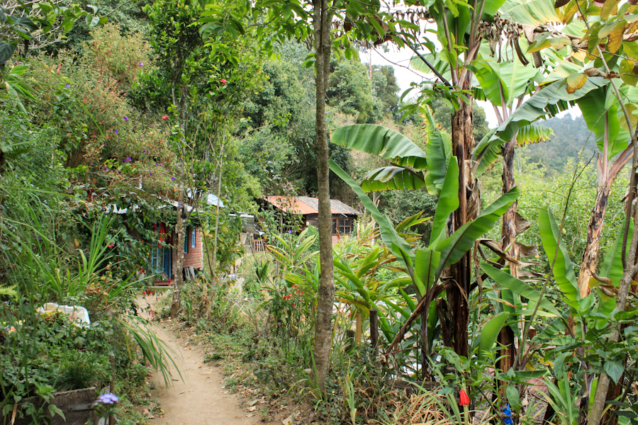Cada lugareño al que cruzábamos y le lanzábamos nuestro ameno “you know Karuna Farm?” nos mandaba a seguir pateando. “This way, this way… One more kilometer…” Así fue como después de media hora de incertidumbres y bastante más de mil metros vimos que el camino de tierra, piedras y tosca por el que andábamos se transformaba, barranca abajo, en un sendero selvático entre bananos, paltas, eucaliptus, limoneros y jackfruits entre otros.