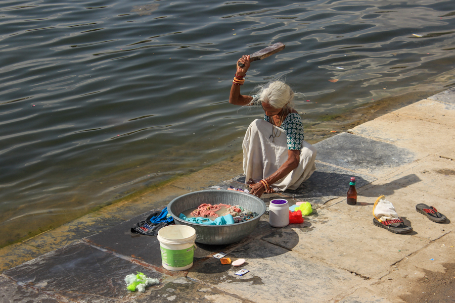 Lo que sí es común en otros lados, y como también acá, es ver mujeres estrujando ropa contra los escalones de los gaths, sea en lagos o ríos.