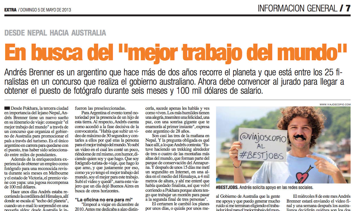 Así que estamos en camino! Y con todo! Hace una semana mandé el video contándoles cómo me moví desde entonces para poder lograr desde el medio del Himalaya nepalí todo lo que me pedían. Mañana alrededor de las 18.30 de Australia estarán anunciando a los finalistas. Queda un día. Y sigue en pie la campaña “Colchones para todos”, para todos aquellos que manden buena energía en estas 24 hs. con el fin de que VIAJOSCOPIO esté entre los tres finalistas del certamen.