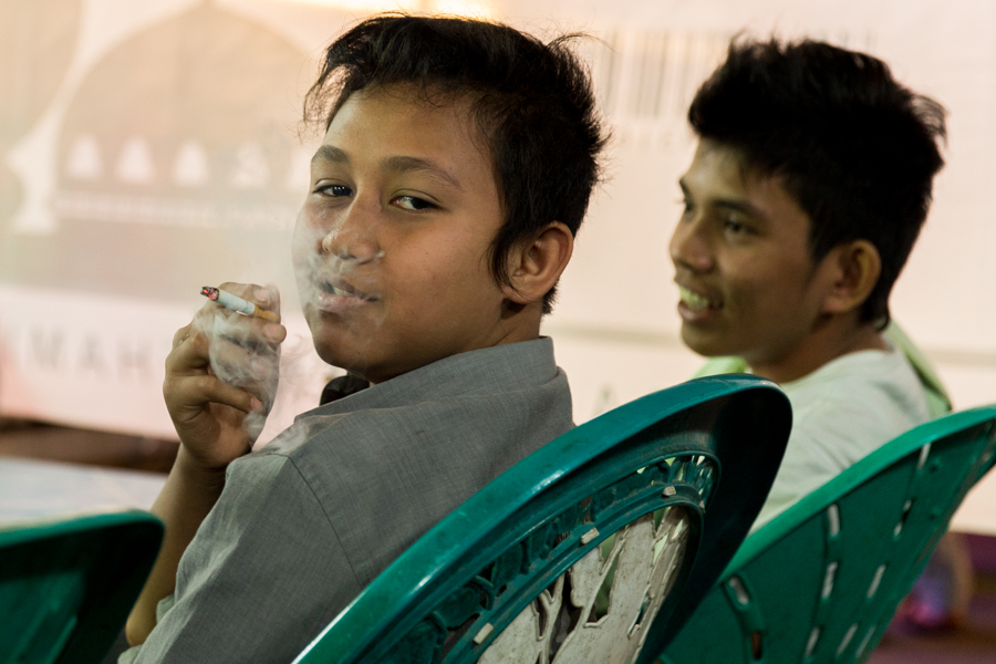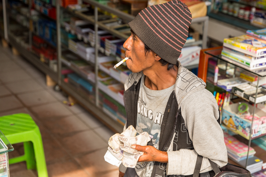 Los que fuman y los que no, en Indonesia fumamos todos. La adicción ante la que languidece la fuerza de voluntad de hasta los más rudos, parece no encontrar límites en tierras del archipiélago. Desde pasajeros que se prenden un cigarrillo de trasnoche adentro de un colectivo cerrado herméticamente por el aire acondicionado hasta pequeñines que hace poco dejaron los pañales y se creen pillos por mostrarse humeando frente a amiguitos y desconocidos, cualquier masculino en el contexto que sea suele ir acompañado por un cigarro entre manos.