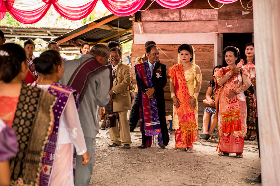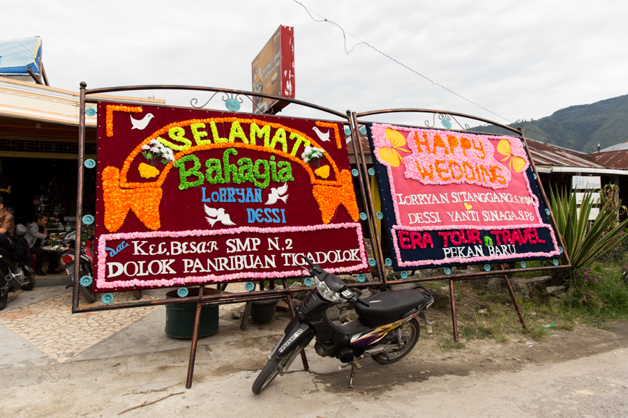 Pero hay algunas reglas para buscar pareja: la comunidad Batak se divide en clanes, grandes familias que se denominan Margas. Estos clanes son muy importantes y sus integrantes no pueden casarse entre ellos, incluso aunque no haya parentesco sanguíneo. No es el caso de Lorryan y Dessi, a quienes con estos carteles se les da la bienvenida hacia la nueva vida de casados.