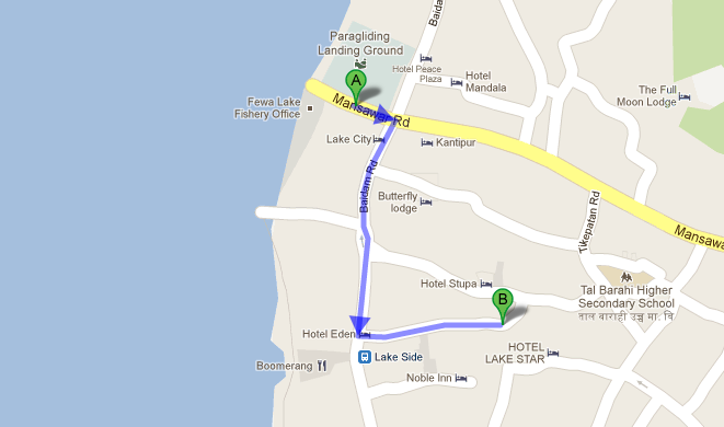 Itinerario desde la estación de buses locales de Pokhara hasta el Vardan Resort n´ Apartments.
