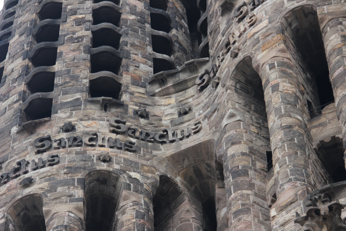 Inscripciones en las torres de la fachada del nacimiento. Las viceras están pensadas para que el agua no entre y también en función de la acústica de los campanarios.