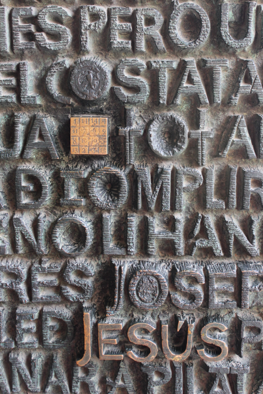El detalle de la puerta de entrada en la fachada de la pasión, con los años de Jesús cuando fue crucificado.