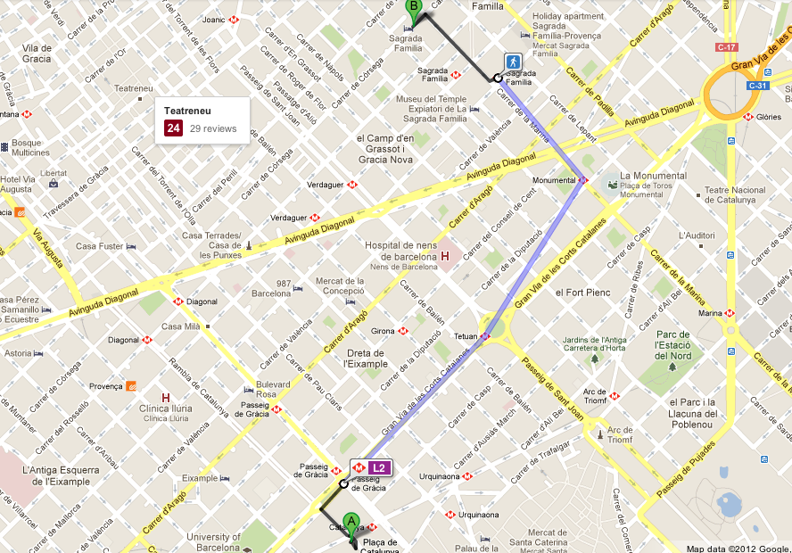 El trayecto en la línea 2 del Metro y lo que hay que caminar. La línea 5 te deja en la misma estación.