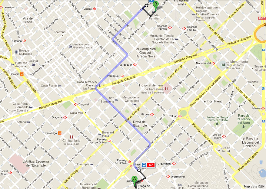 Tomar el número 47 en Passeig de Gracia y Ronda de Sant Pere hasta Carrer Industria y Sardenya.