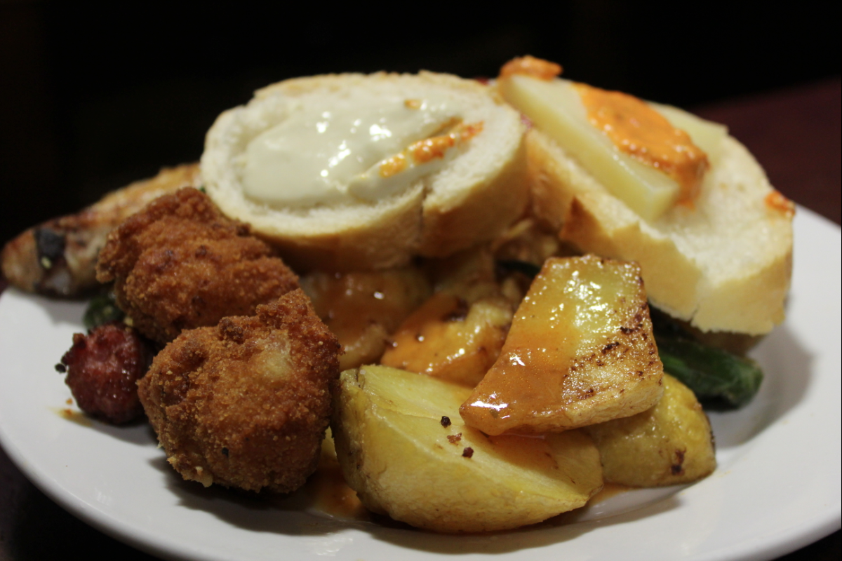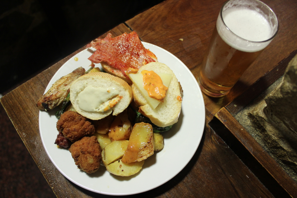 En la montaña de comida que yacía junto a mi cerveza (que además era más grande de lo que se acostumbra acá) se divisaban croquetas de jamón y queso, ajíes de todos los colores, papas con salsita gourmet, salchicha parrillera, pollo y distintas tapas a base de pan: con jamón, con queso gruyere y con salsa de rockefort y otros quesos. Un banquete de verdad, no como esos bistecs de finísimas berenjenas salteadas en extractos de su colorido jugo que te sirven en Palermo Chic. Y lo mejor, la panzada viene con cerveza incluida por la módica suma de €2,5.